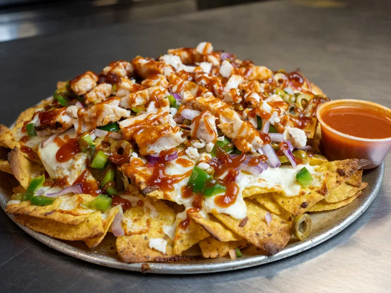 Generous plate of tortilla chips topped with tender chicken, melted cheese and fresh vegetables.